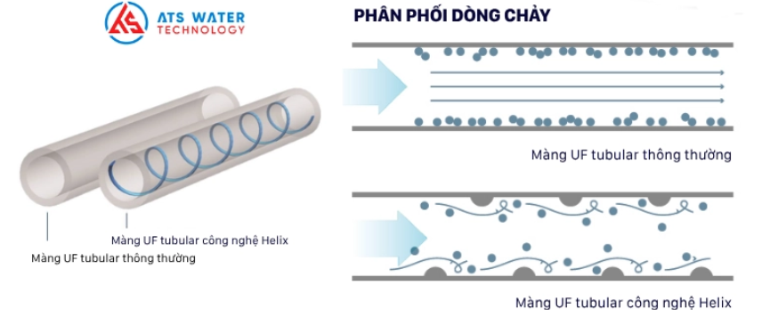 Thay vì để dòng nước chảy thẳng qua màng UF như thông thường, Helix tạo dòng rối có hướng, giúp cuốn trôi cặn bẩn ra khỏi bề mặt màng ngay trong quá trình vận hành — giảm sự tích tụ cặn và kéo dài tuổi thọ màng.