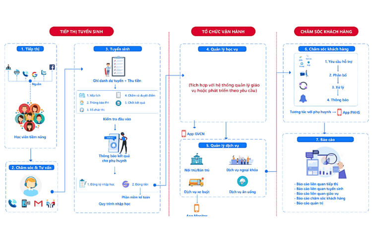 Hệ thống có 50+ mẫu báo cáo có sẵn (Tuyển sinh, Tài chính, CSKH...),khả năng tạo báo cáo động, tùy chỉnh , và Dashboard trực quan, cập nhật liên tục. Điều này giúp rút ngắn thời gian ra quyết định và tăng hiệu quả quản trị ~38%.