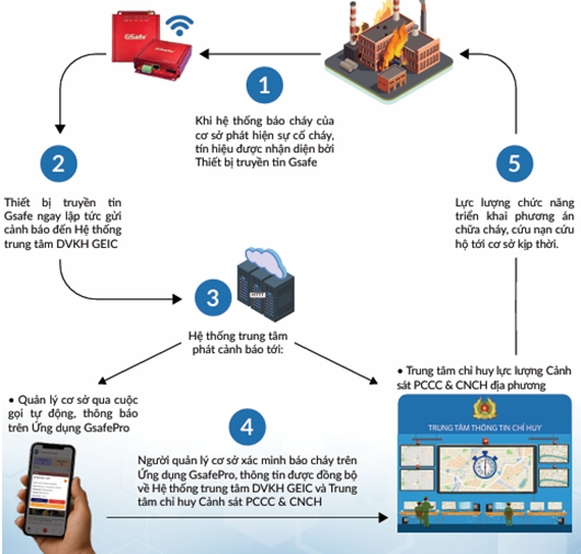 GSafe kết nối trực tiếp với tủ trung tâm báo cháy, thu nhận toàn bộ tín hiệu từ đầu báo khói, đầu báo nhiệt, nút ấn khẩn và gửi ngay lập tức về Trung tâm Chỉ huy PCCC qua hạ tầng viễn thông chuyên dụng. Nhờ đó, mọi sự cố được phát hiện sớm, rút ngắn thời gian ứng phó của cơ sở và lực lượng chức năng, giảm thiểu tối đa thiệt hại.
