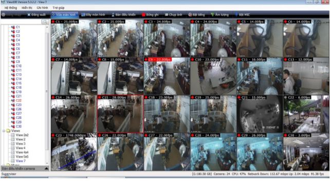 Hiển thị đồng thời | Tối đa 144 camera (kích cỡ 12x12). Có thể tạo các view (layout) bằng cách định nghĩa số hàng, số cột và kéo thả camera vào vị trí mong muốn |