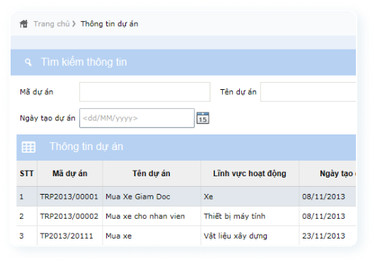 Ví dụ: Doanh nghiệp lập kế hoạch mua sắm thiết bị cho hệ thống CNTT, trong đó có dự án mở rộng phòng Kỹ thuật, khi đó người dùng cần tạo dự án là “mở rộng phòng Kỹ thuật”.