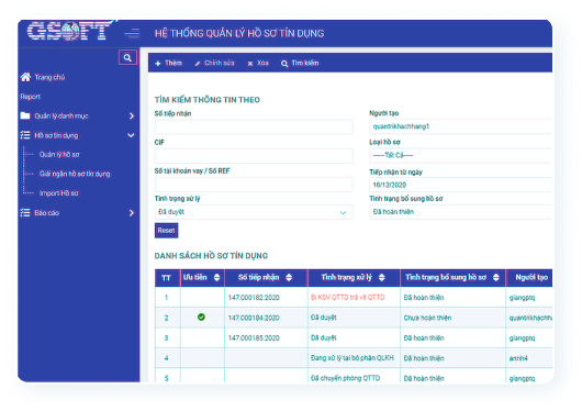 - Toàn bộ thông tin liên quan đến hồ sơ tín dụng như: tên khách hàng, số CIF, REF, loại hồ sơ (giải ngân/bảo lãnh/chung),… đều được quản lý trên hệ thống phần mềm.