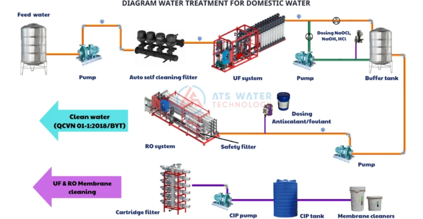 Quy trình xử lý nước cấp ứng dụng công nghệ RO giúp loại bỏ tạp chất, vi khuẩn, kim loại nặng và các hợp chất hữu cơ, đảm bảo nguồn nước đầu ra đạt tiêu chuẩn QCVN 01-1:2018/BYT. Nhờ đó, nước sau xử lý có thể được sử dụng trong nhiều ngành sản xuất, đáp ứng các yêu cầu khắt khe về chất lượng và an toàn.