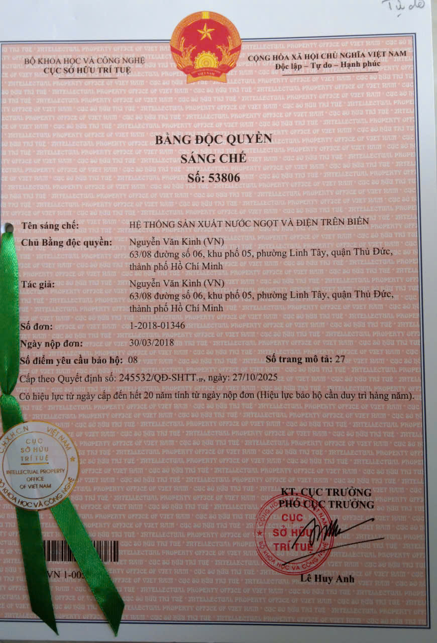 Do đó, mục đích của sáng chế là khai thác năng lượng tái tạo vô tận, rẻ, sạch trên đại dương để sản xuất nước ngọt và điện thay thế các nguồn năng lượng khác đáp ứng nhu cầu không ngừng gia tăng của nhân loại, đồng thời giải quyêt các cuộc khủng hoảng khác của thời đại.
