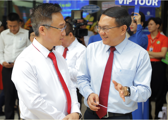 Giám đốc Sở KH&CN TP.HCM Lâm Đình Thắng trao đổi với ông Đặng Minh Thông - Phó Bí thư Thành ủy TP.HCM, tại sự kiện.