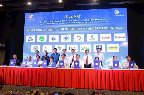 Các đại biểu thực hiện nghi lễ ra mắt sàn giao dịch công nghệ TP.HCM mới.