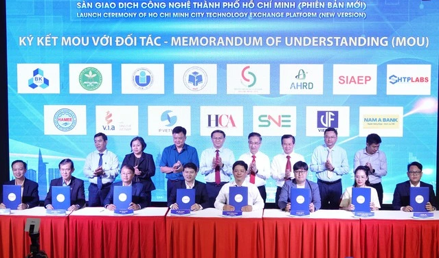 Các doanh nghiệp ký kết chuyển giao công nghệ trong buổi ra mắt Sàn giao dịch công nghệ TP.HCM phiên bản mới