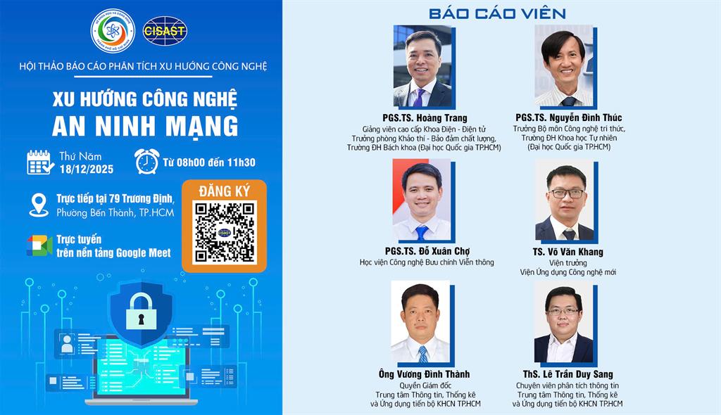 Để giúp các nhà quản lý, nhà khoa học và doanh nghiệp có thêm thông tin về các xu hướng phát triển công nghệ an ninh mạng trên thế giới cũng như tình hình nghiên cứu, ứng dụng trong nước, Trung tâm Thông tin, Thống kê và Ứng dụng tiến bộ khoa học công nghệ TP.HCM tổ chức hội thảo báo cáo phân tích xu hướng công nghệ với chủ đề: “Xu hướng công nghệ an ninh mạng”, với báo cáo viên là chuyên gia đến từ các trường đại học, viện nghiên cứu và doanh nghiệp.
