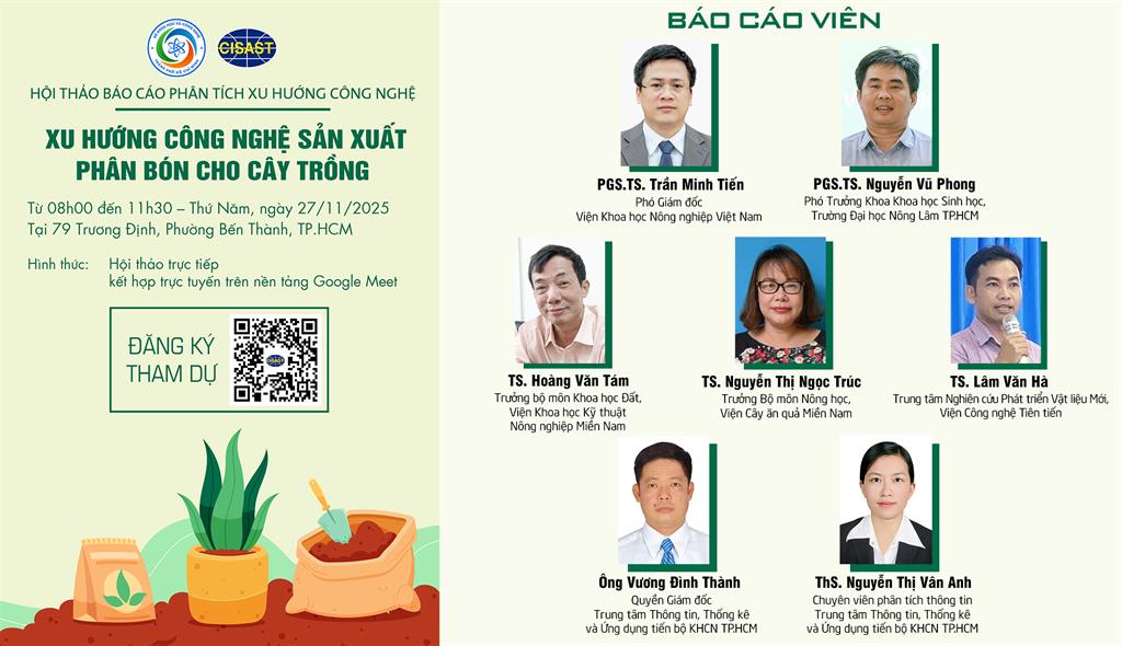 Để giúp các nhà quản lý, nhà khoa học và doanh nghiệp có thêm thông tin về các xu hướng nghiên cứu, ứng dụng phân bón trong và ngoài nước, nhằm thúc đẩy phát triển nông nghiệp bền vững và nâng cao hiệu quả sử dụng tài nguyên đất, nước, Trung tâm Thông tin, Thống kê và Ứng dụng Tiến bộ khoa học công nghệ TP.HCM tổ chức hội thảo báo cáo phân tích xu hướng công nghệ, chủ đề: “Xu hướng công nghệ sản xuất phân bón cho cây trồng”, với báo cáo viên là chuyên gia đến từ các viện nghiên cứu và trường đại học.