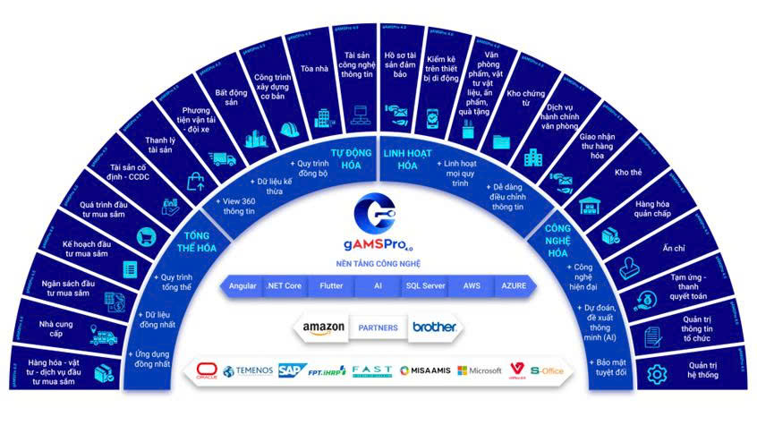 Đây là hệ thống tích hợp tới 18 phân hệ nghiệp vụ, bao phủ toàn bộ vòng đời tài sản từ khâu lập kế hoạch đầu tư, phê duyệt mua sắm, nghiệm thu - nhập kho, cấp phát sử dụng, theo dõi bảo hành - bảo trì, khấu hao cho đến thu hồi, thanh lý. gAMSPro đồng thời đáp ứng nhu cầu quản lý của nhiều đơn vị chức năng như: Hành chính - Quản trị, Kế hoạch - Tài chính, Mua sắm, Kế toán, Quản lý đội xe, Quản lý xây dựng cơ bản…, đặc biệt giúp Ban Giám hiệu theo dõi tổng thể “bức tranh tài sản” của nhà trường theo thời gian thực.