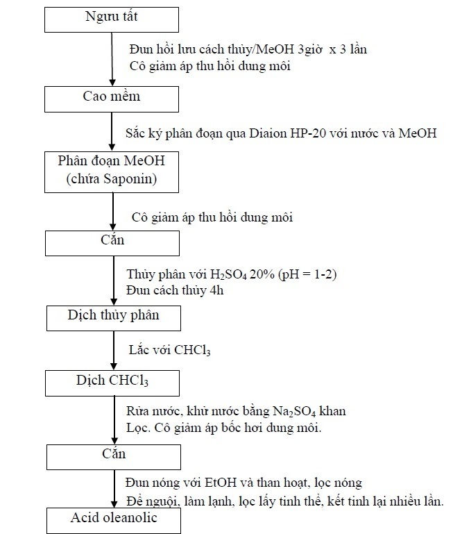Ngưu tất xắt nhỏ (kích thước lát xắt khoảng 35 mm), chiết hồi lưu nóng bằng MeOH (methanol). Dịch chiết MeOH được cô quay dưới áp suất giảm thu được cao mềm Ngưu tất. Chiết xuất phân đoạn cao Ngưu tất bằng cột Diaion HP-20 với dung môi rửa giải lần lượt là nước cất và MeOH. Kiểm tra sự chiết kiệt các chất trong mỗi phân đoạn bằng TT. H2SO4 20%/EtOH (ethanol) 50% trên bản mỏng sắc ký. Dịch chiết MeOH được gom chung và cô giảm áp để thu được cắn saponin thô toàn phần.