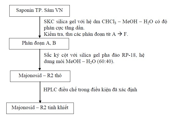 Phân đoạn A, B thu được ở trên được gom chung và sắc ký qua cột sắc ký pha đảo với silica gel RP18 với hệ dung môi MeOH–H2O (60:40). Majonosid-R2 thu được dưới dạng bột màu trắng. MR2 thu được kiểm tra trên HPLC nếu thấy còn lẫn chất khác nhất là ginsenosid Rg1 tiếp tục được tinh chế bằng phương pháp HPLC. Sau khi thu được majonosid–R2 tinh khiết, tiến hành định tính, xác định cấu trúc và thẩm định.