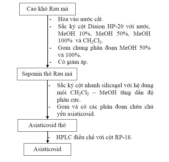 Cao khô rau má được cho qua cột Diaion-HP20, rửa giải lần lượt với MeOH 10%, MeOH 50%, MeOH 100% rồi với dicloromethan. Các phân đoạn MeOH 50% và MeOH 100% được gộp chung, cô thu hồi dung môi dưới áp suất giảm, thu được cắn saponin toàn phần. Cắn này được phân tách bằng cách sử dụng sắc ký cột nhanh với dung môi lên cột là dicloromethan, rửa giải với dung môi dicloromethan–methanol độ phân cực tăng dần, thu lấy các phân đoạn chứa asiaticosid. Cô thu hồi được asiaticosid thô. Asiaticosid thô được tinh chế bằng cách sử dụng sắc ký lỏng cao áp điều chế để thu được asiaticosid tinh khiết.