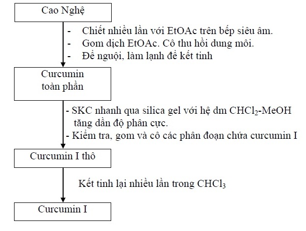Cao nghệ được chiết nhiều lần với ethyl acetat bằng cách khuấy và đánh siêu âm. Lọc thu lấy dịch ethyl acetat và sau đó loại tạp bằng cách lắc với nước. Gộp tất cả dịch ethyl acetat thu được và cô quay giảm áp thu hồi dung môi, làm lạnh, curcumin toàn phần sẽ kết tinh. Lọc thu lấy hỗn hợp curcumin toàn phần kết tinh. Phân lập curcumin I từ hỗn hợp curcumin toàn phần bằng phương pháp sắc ký cột cổ điển, với hệ dung môi CH2Cl2-MeOH. Kiểm tra và thu lấy phân đoạn có curcumin I, cô quay dưới áp suất giảm thu được curcumin I thô. Curcumin I thô thu được được kết tinh nhiều lần trong cloroform để thu được curcumin I tinh khiết. Sau khi thu được curcumin I tinh khiết, tiến hành định tính, xác định cấu trúc và thẩm định.