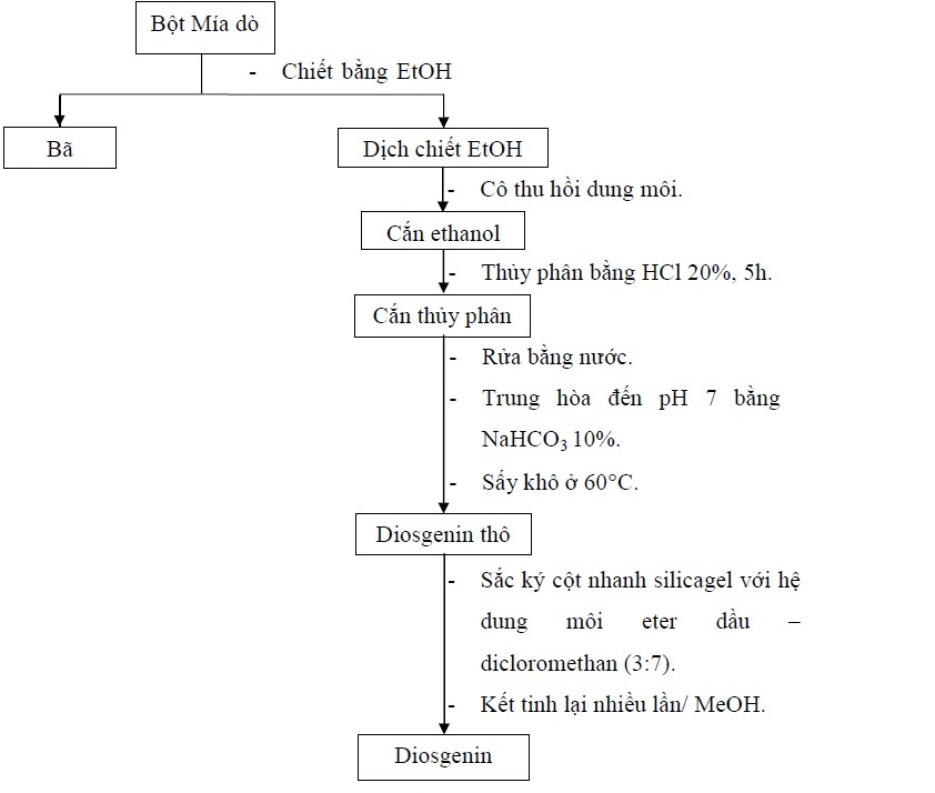 Bột thân rễ Mía dò được chiết hồi lưu với dung môi ethanol 96%. Dịch chiết được lọc, cô chân không đến cắn, thu hồi dung môi. Cắn được thủy phân với HCl 20% trong 5 giờ, tách lấy phần rắn, rửa bằng nước cất và NaHCO3 10% đến pH 7. Tiếp tục sử dụng sắc ký cột nhanh để tách lấy phân đoạn chứa diosgenin với hệ dung môi ban đầu lên cột là ether dầu–dicloromethan (3:7), tiếp tục tăng dần độ phân cực. Diosgenin thô được tinh chế bằng phương pháp kết tinh lại trong methanol. Sau khi thu được diosgenin tinh khiết, tiến hành định tính, xác định cấu trúc và thẩm định.