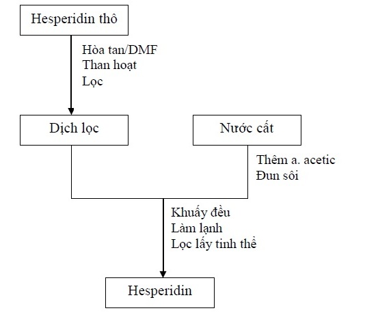 Tinh khiết hóa hesperidin thô (hàm lượng >80%) bằng phương pháp kết tinh lại trong dung môi. Cân 1 g hesperidin thô hòa với 7 ml dimetylformamid, khuấy đều cho tan trong 15 phút. Thêm một ít than hoạt, khuấy đều. Lọc dưới áp suất kém thu được dịch lọc. Đun 20 ml nước cất với 0,5 ml acid acetic đến sôi rồi cho toàn bộ dịch lọc vào. Khuấy đều, làm lạnh, hesperidin sẽ kết tinh. Lọc lấy tinh thể. Lặp lại quá trình kết tinh nhiều lần để thu được hesperidin tinh khiết. Sau khi thu được hesperidin tinh khiết, tiến hành định tính, xác định cấu trúc và thẩm định.