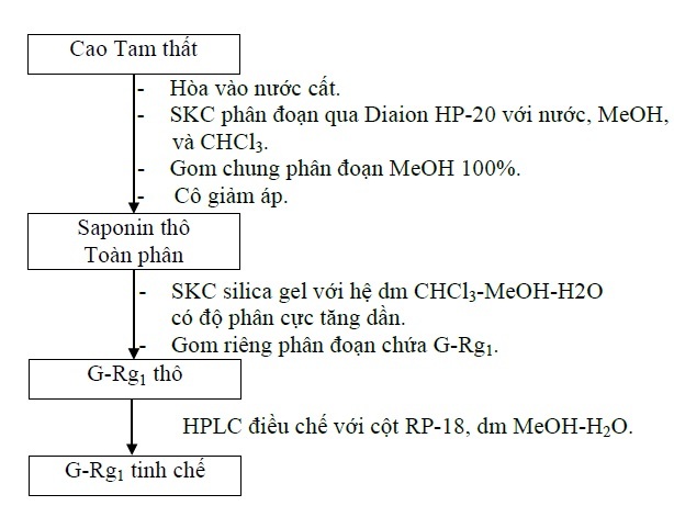 Chọn phân đoạn có chứa ginsenosid-Rg1. Thu lấy các phân đoạn này và tiếp tục tiến hành HPLC điều chế để thu ginsenosid-Rg1 tinh khiết. Hứng lấy phân đoạn có xuất hiện pic ginsenosid-Rg1. Dung dịch thu được sau đó tiến hành đông khô và thu lấy hợp chất tinh khiết. Sau khi thu được ginsenosid-Rg1 tinh khiết, tiến hành định tính, xác định cấu trúc và thẩm định.